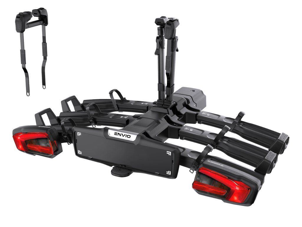 ENVIO eMAX 3 je robustný nosič bicyklov na ťažné zariadenie pre 3 bicykle vrátane elektrobicyklov. Ponúka vysokú stabilitu, pevné uchytenie a pohodlnú manipuláciu pri nakladaní aj používaní. Vďaka sklopnej konštrukcii umožňuje pohodlný prístup do kufra aj s naloženými bicyklami.