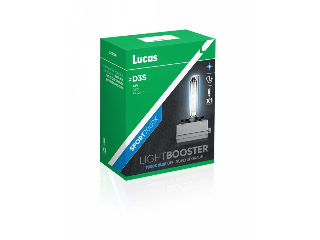 Xenónové výbojky LUCAS LIGHTBOOSTER SPORT7000K s modrým efektom a svietivosťou neuveritelnych až 7000 K vám zabezpečia maximálnu kontrolu nad vozovkou za každého počasia a svetla. Poskytujú o 200% viac svetla oproti štandardnej halogénovej žiarovke. Xenónové výbojky produkujú medzi 2800 a 3500 lumenov (svetelný výkon), pri príkone od 35 do 85 wattov a napájaní 12,8 V. Pre porovnanie štandardná halogénová žiarovka vytvára od 700 až 2100 lumenov. Výbojky majú tiež priemernú životnosť 2000 hodín v porovnaní so štandardnou žiarovkou, ktorá má životnosť medzi 450 až 1000 hodín. Rada výbojok LUCAS zahŕňa komplexnú kolekciu HID svetiel vrátane D1R, D1S, D2R, D2S, D3R, D3S, D4R a D4S.