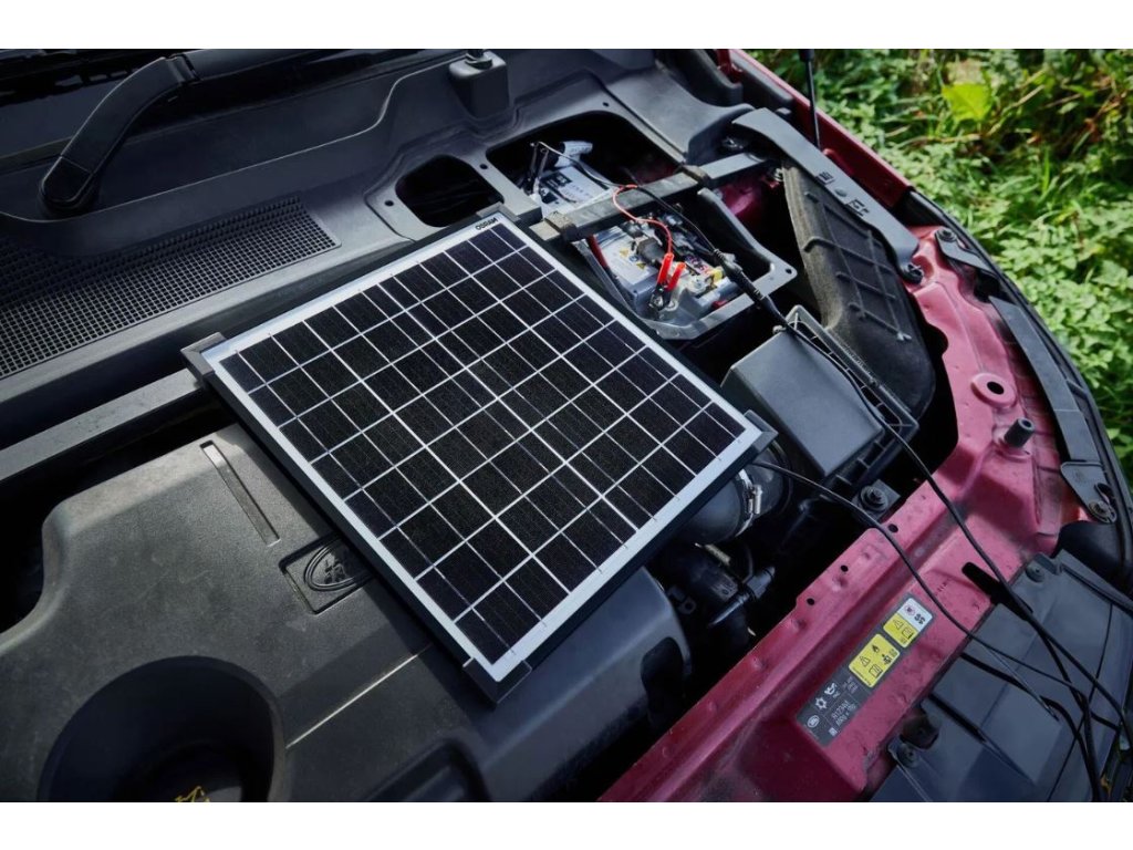Dodáva sa s DC zástrčkou a klipmi na batérii, funguje aj pri zatiahnutej oblohe a je vodeodolný s krytím IP 65. Ochrana proti prepólovaniu zabraňuje poškodeniu, pokiaľ sú svorky pripojené k nesprávnym pólom batérie.
