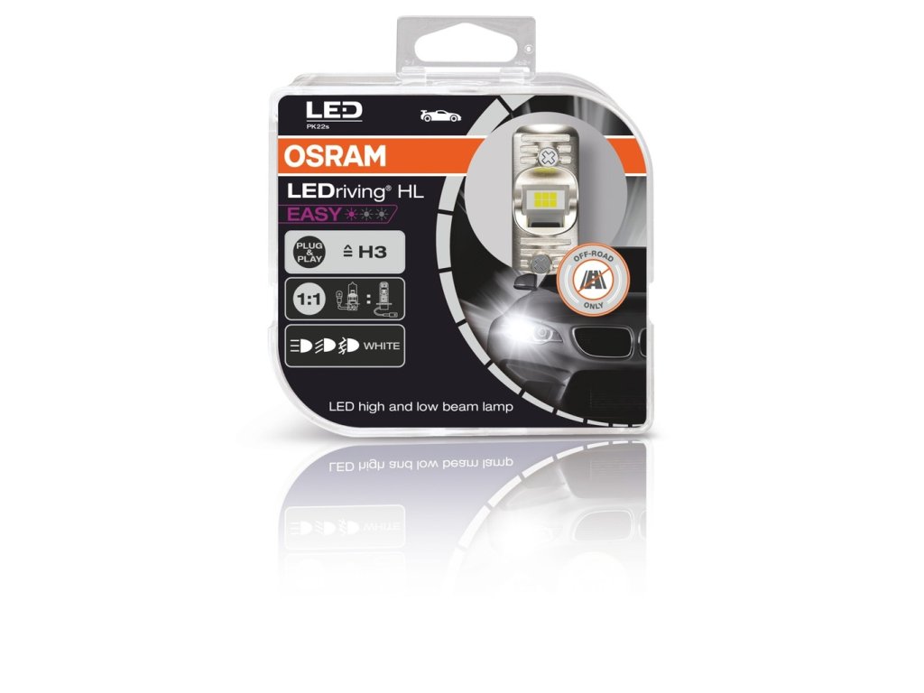 LED žiarovky pre diaľkové a stretávacie svetlá so systémom plug & play: nie sú potrebné žiadne adaptéry a krytky Vďaka riešeniu založenému na kompaktných rozmeroch poskytujú svetelné zdroje OSRAM LEDriving HL EASY ultrakompaktnú náhradu bežných diaľkových a stretávacích autožiaroviek H3/H7/H18, H4/H19 a H15 so studeným bielym svetlom, štýlovým vzhľadom a vynikajúcim jasom. Ponúka jednoduchú inštaláciu plug & play s optimalizovanou kompatibilitou: nie sú potrebné žiadne adaptéry a krytky! Optimalizovaný vysokorýchlostný ventilátor zaisťuje aktívne chladenie - vďaka maximalizovanému odvodu tepla je možný vyšší svetelný výkon. LEDriving HL EASY pre diaľkové a stretávacie svetlá od spoločnosti OSRAM nahrádzajú bežné halogénové žiarovky, sú kompatibilné s 12 V a majú studenú bielu farbu svetla. Vďaka najnovšej LED technológii a veľmi kompaktnému dizajnu umožňujú tieto LED žiarovky vysokú kompatibilitu a jednoduchú inštaláciu do vozidiel s pôvodne halogénovými svetlometmi. Tieto výrobky nemajú schválenie ECE a nesmú sa používať na verejných komunikáciách. Použitie na verejných komunikáciách môže viesť odobratiu technického preukazu a strate poistného krytia. V niektorých krajinách je predaj a používanie týchto výrobkov zakázané.