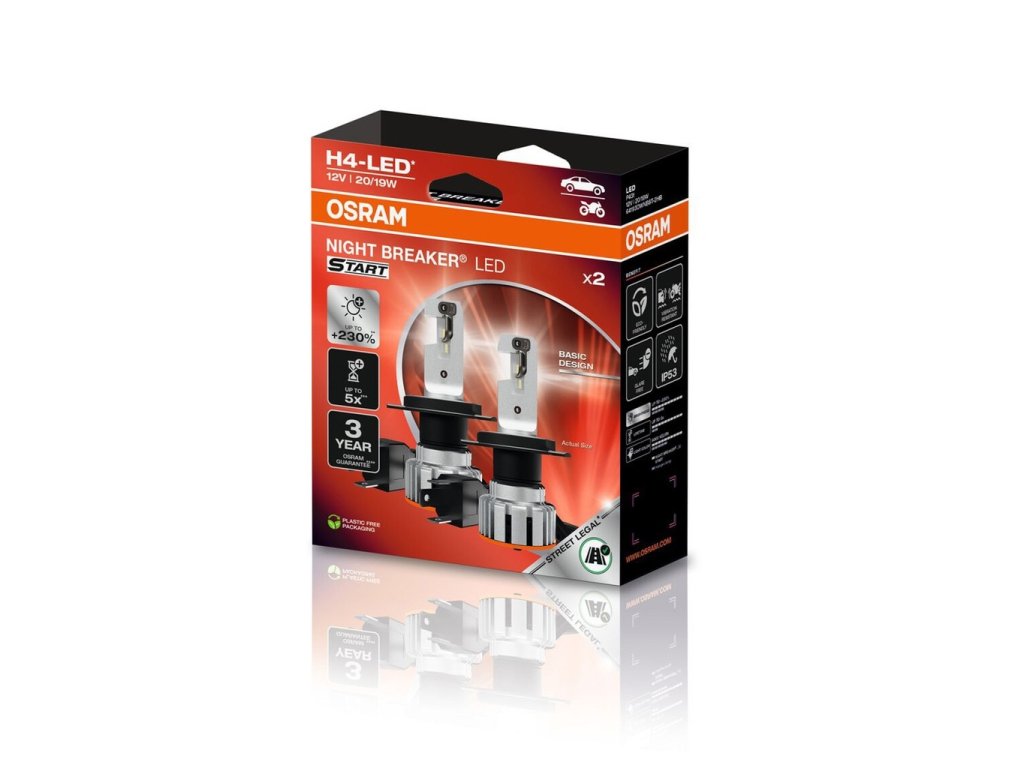 OSRAM START NIGHT BREAKER H4-LED sú cenovo dostupné LED žiarovky od spoločnosti OSRAM, ktoré sú legalizované pre cestnú komunikáciu (aj na Slovensku). LED autožiarovky s farbou svetla 6000 K sa perfektne hodia k LED dennému svieteniu. LED žiarovky sa ľahko inštalujú a sú vhodné do väčšiny svetlometov. Majú integrovaný odpor takže vo väčšine prípadov nehlási žiadnu chybu.