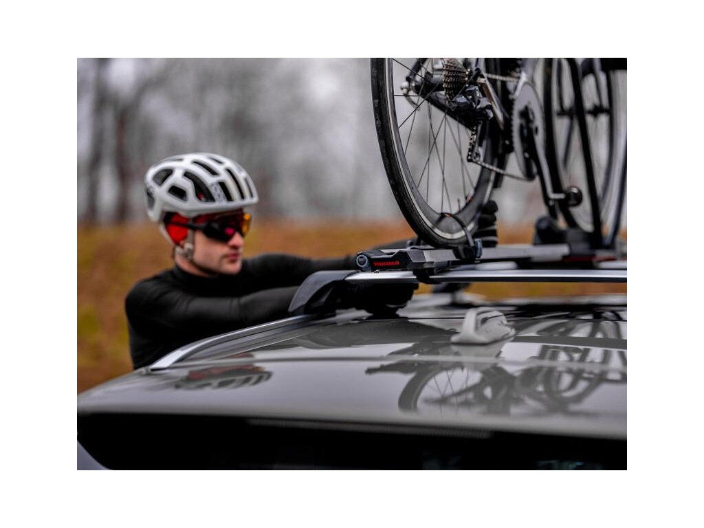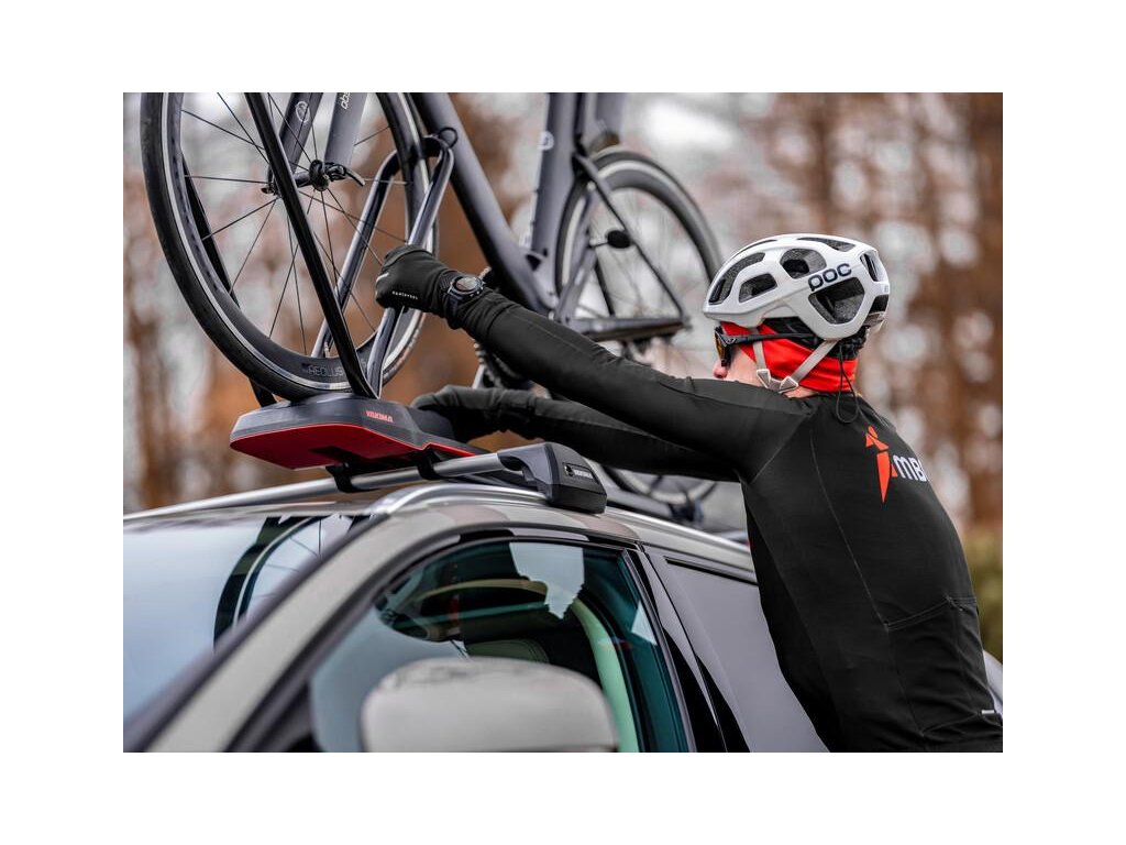 Upevnenie cyklonosiča k základným nosičom je zabezpečené nastaviteľným plastovým popruhom s oceľovou výstuhou, ktorý sa prispôsobí tvaru nosiča. Tento spôsob zaručuje, že cyklonosič uchytíte na akúkoľvek šírku nosičov (s T dážkou aj bez). Nosič po upevnení na strešný nosič zabezpečíte uzamknutím.